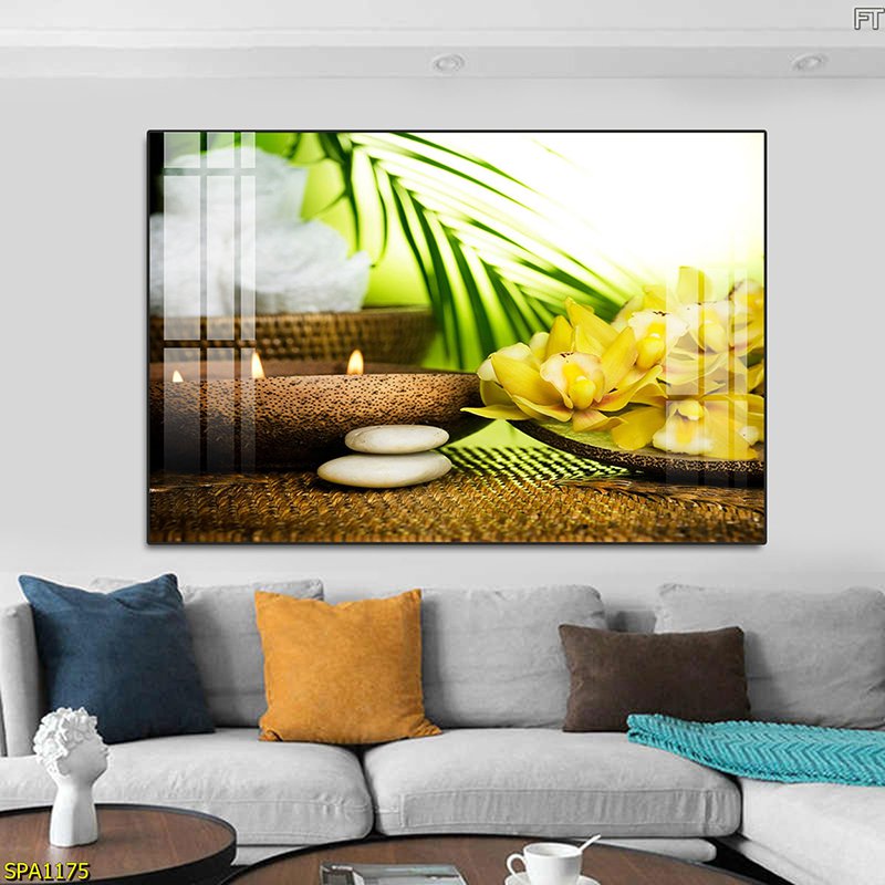Tranh spa thiên nhiên: Các bức tranh này thường hiển thị hình ảnh của thiên nhiên, bao gồm hoa đẹp, viên đá sỏi, nến và cành cây tre. Bức tranh này có mục tiêu tạo ra một không gian thư giãn và mang lại may mắn phong thủy. Hình ảnh thiên nhiên đem đến một cảm giác sạch sẽ, tươi mát và sự hoà quyện với tự nhiên, giúp khách hàng tận hưởng cảm giác thư giãn tối đa.