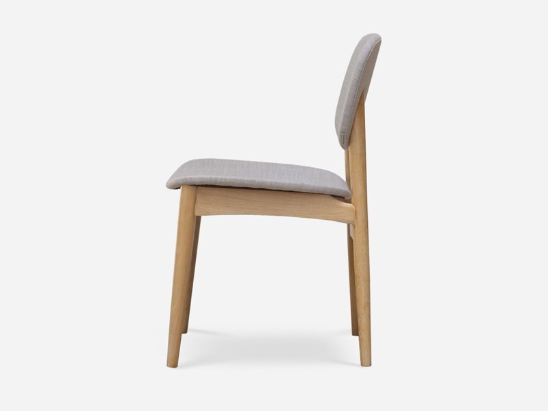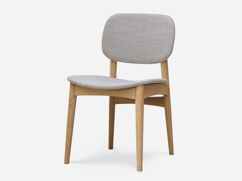 Ghế ăn bọc nệm hiện đại với vẻ bền ngoài chân gỗ sồi tiện tròn điêu khắc độc đáo. Lưng tựa và mặt ngồi ghế bo cong bọc nệm vải đa màu sắc tùy chọn.