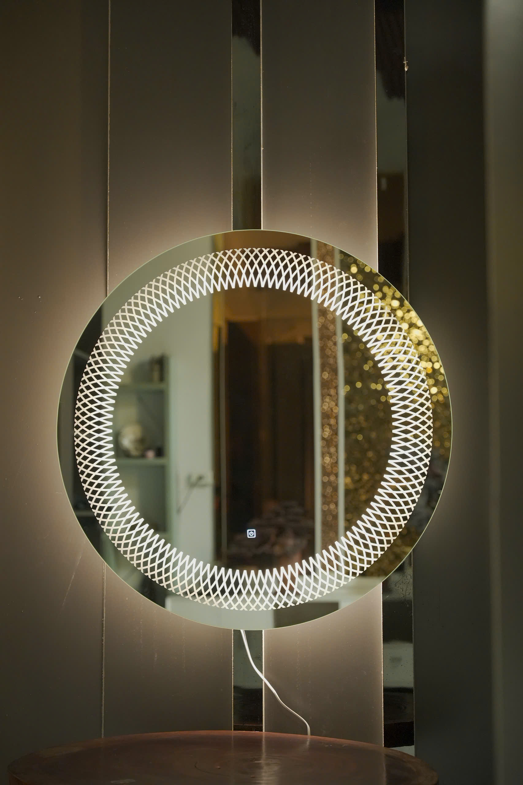 - Gương phòng tắm hình tròn có đèn led dạng lưới độc đáo, thích hợp cho không gian phòng tắm gia đình, homestay, khách sạn, resort,…