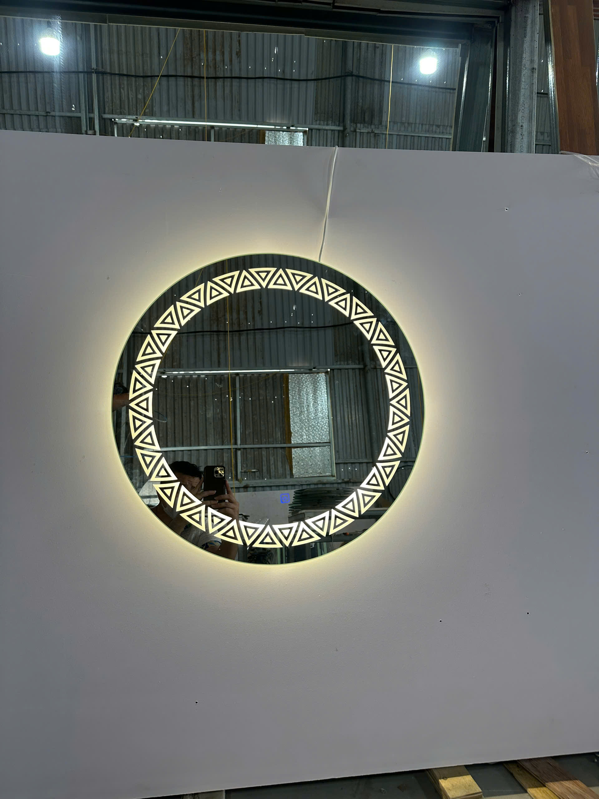 - Gương đèn led tròn viền tam giác decor quán cafe, quán trà sữa